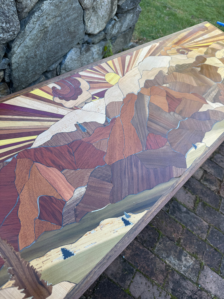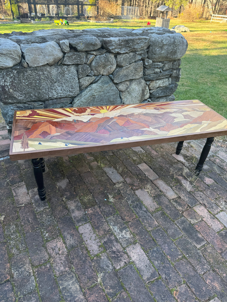 Mixed hardwood mountain bench. Sunburst with swirly skies. Slate trees inlaid throughout. Turned bench legs painted black. Benchtop is framed out in walnut.