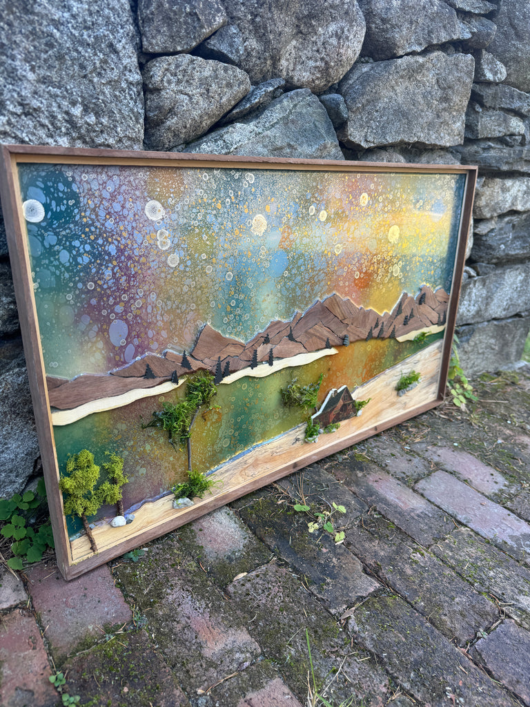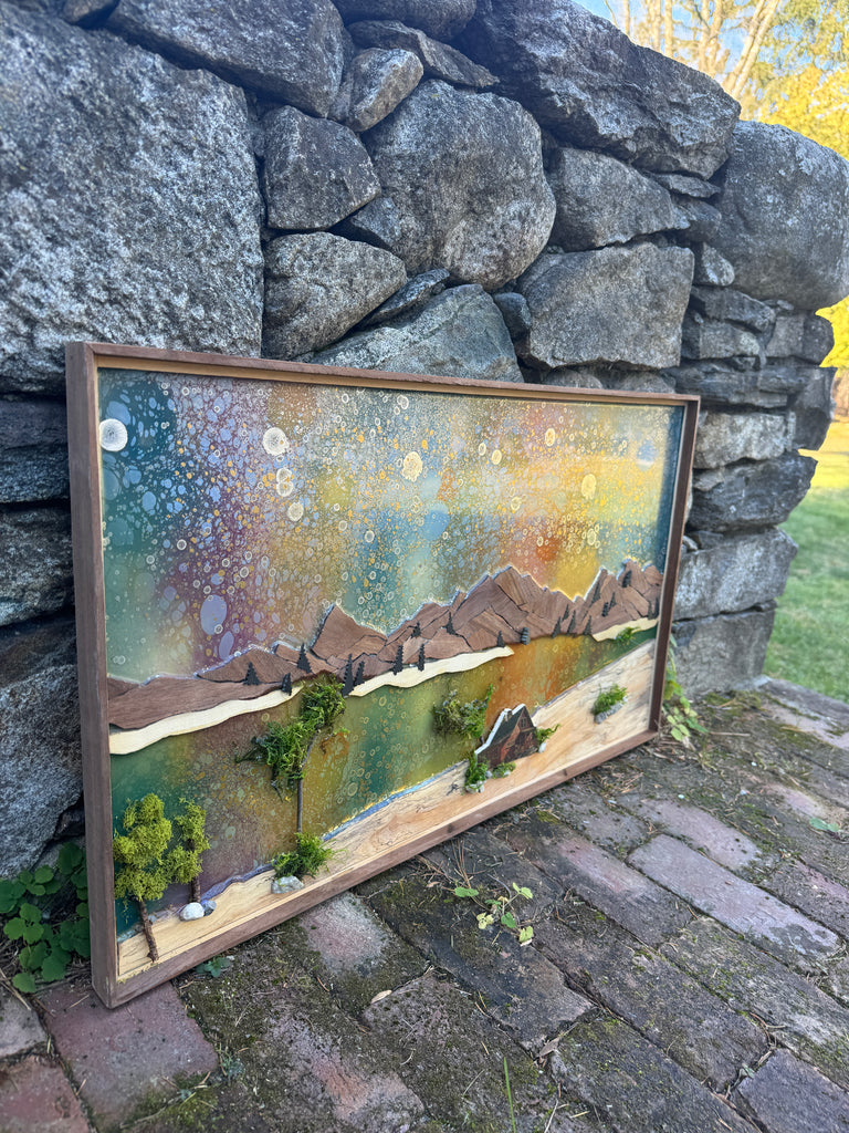 Mountain statement piece. Walnut mountain, resin river and sky, printmaking cabin, slate trees, and mixed media trees