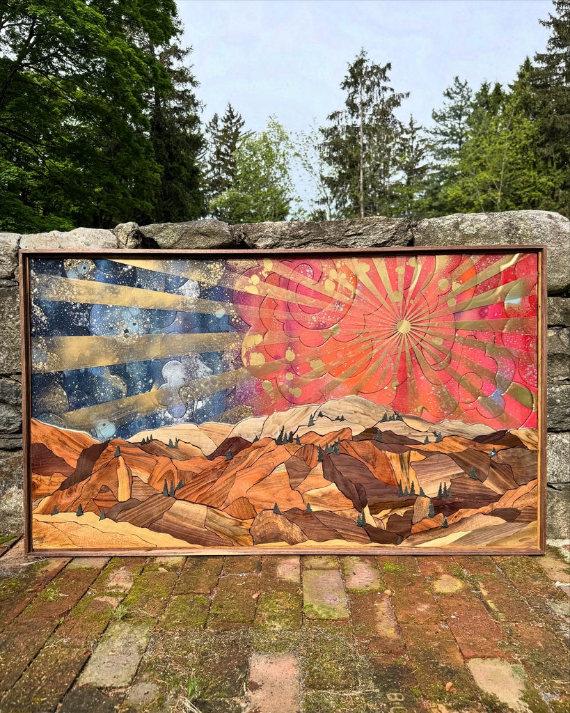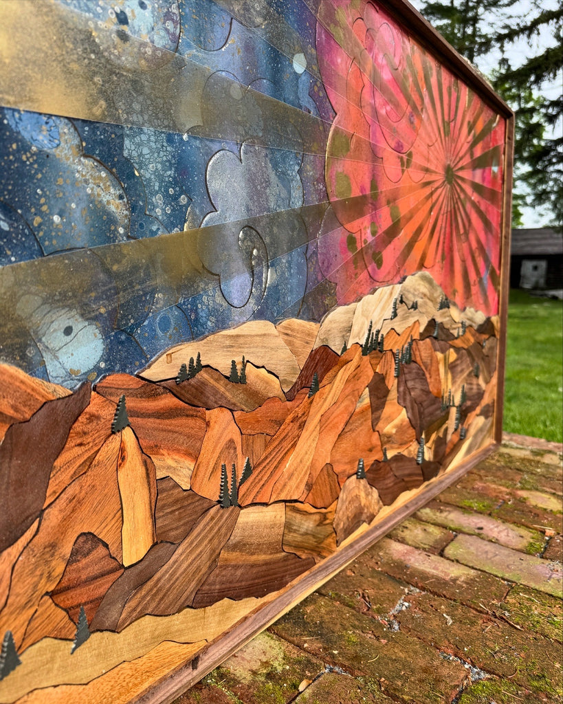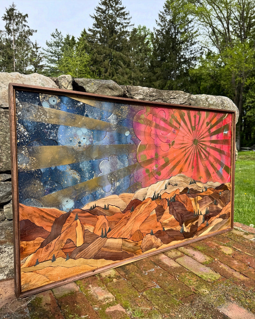 Mountain statement piece with sunburst. Mixed hardwood mtn made up of mostly walnut. Slate trees throughout. Walnut frame.