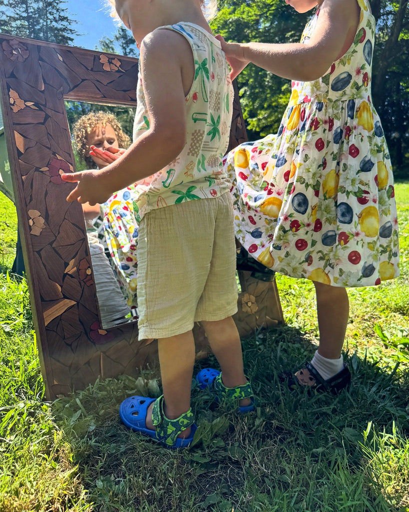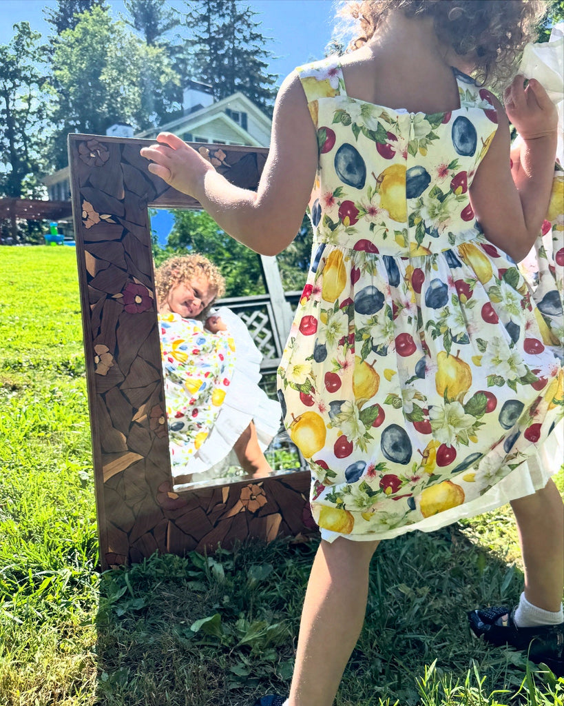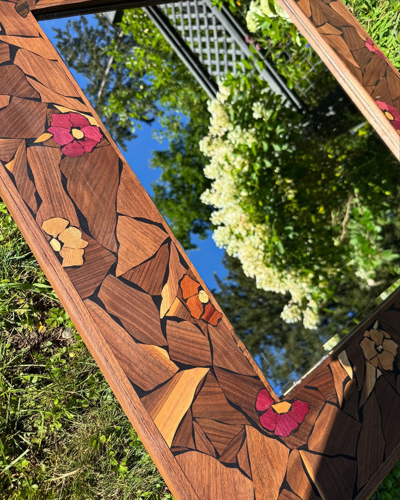 Mixed hardwood mirror. Mostly walnut. Flowers made of purple heart, maple, and cherry.