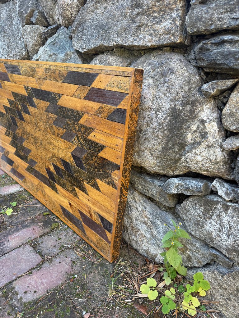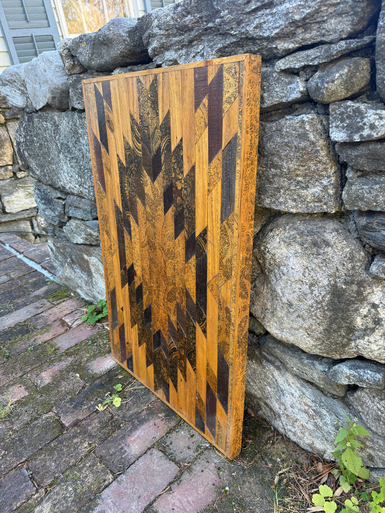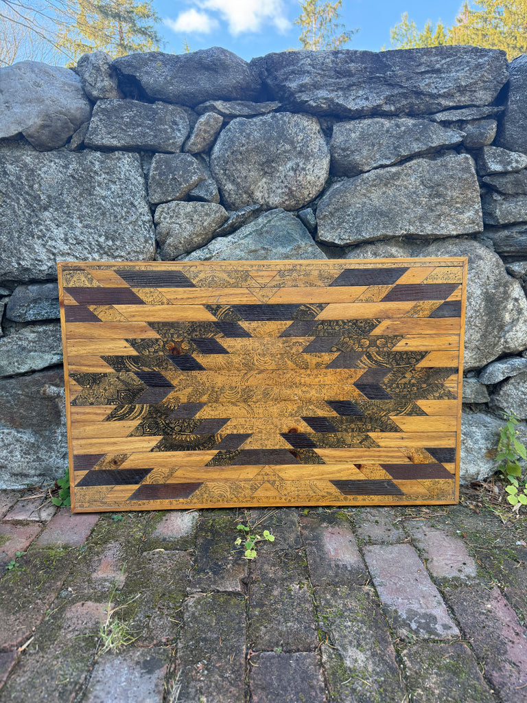 Geometric art pieces made of reclaimed wood and printmaking pieces. Framed in printmaking pieces. Can be hung vertically or horizontally.