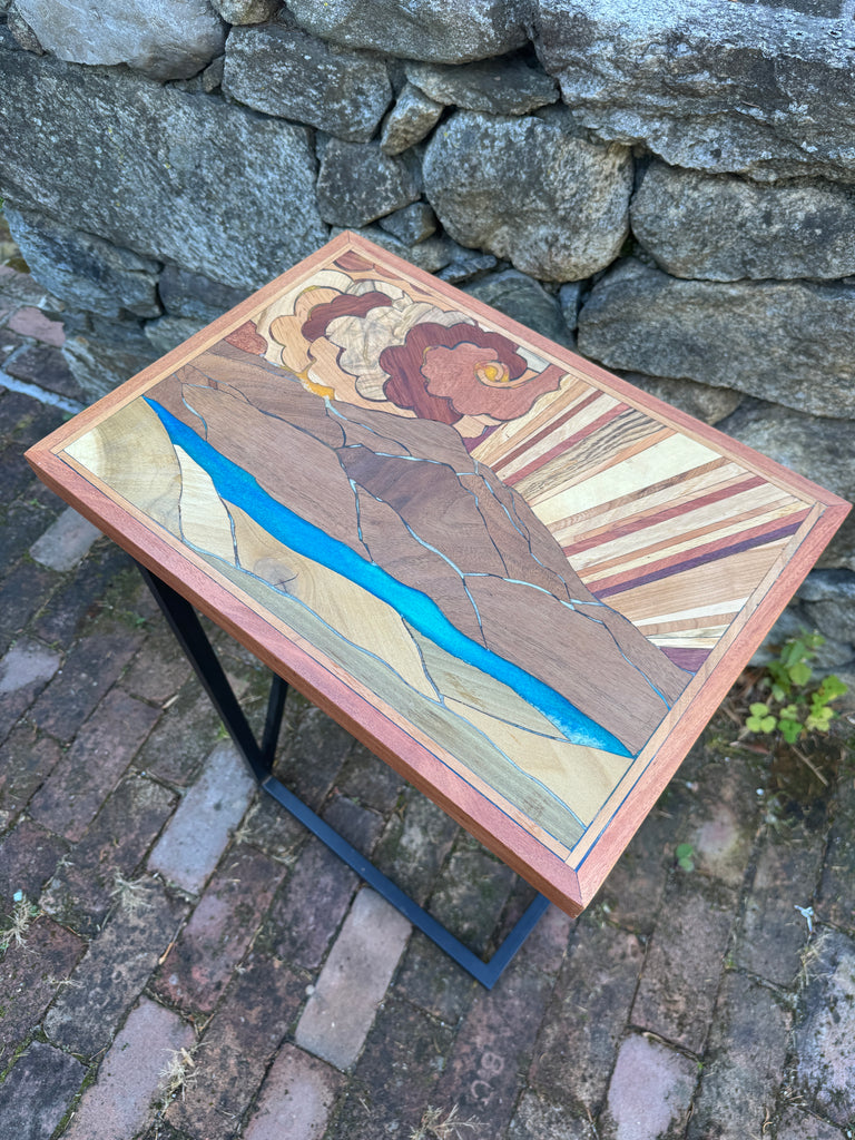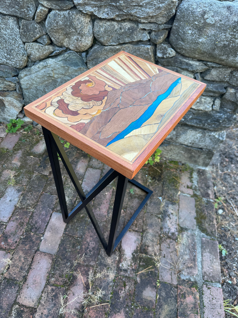 Mixed hardwood side table. Sunburst with swirly skies. Resin river.  Metal tableleg.