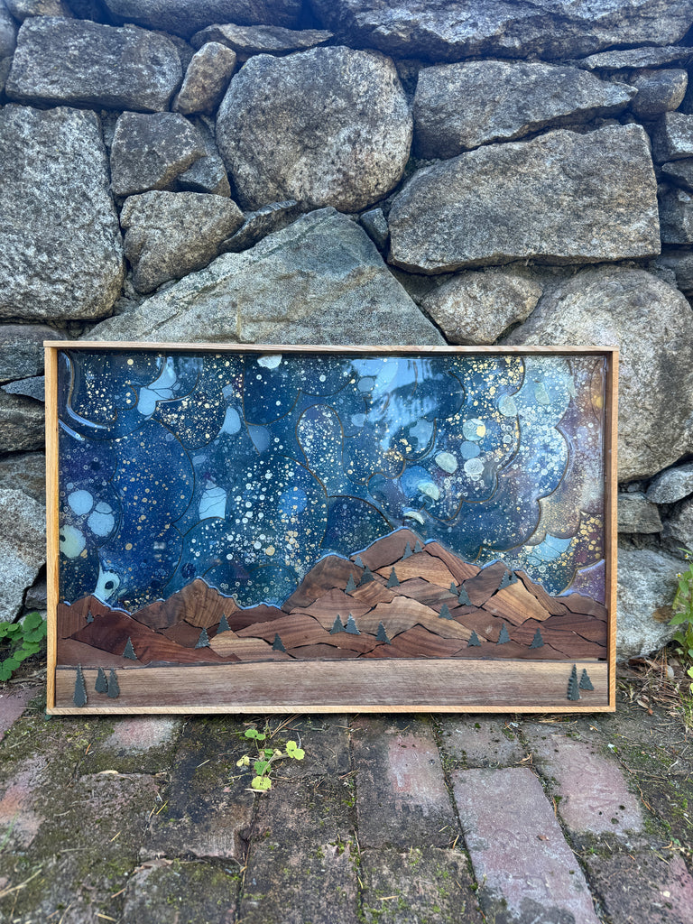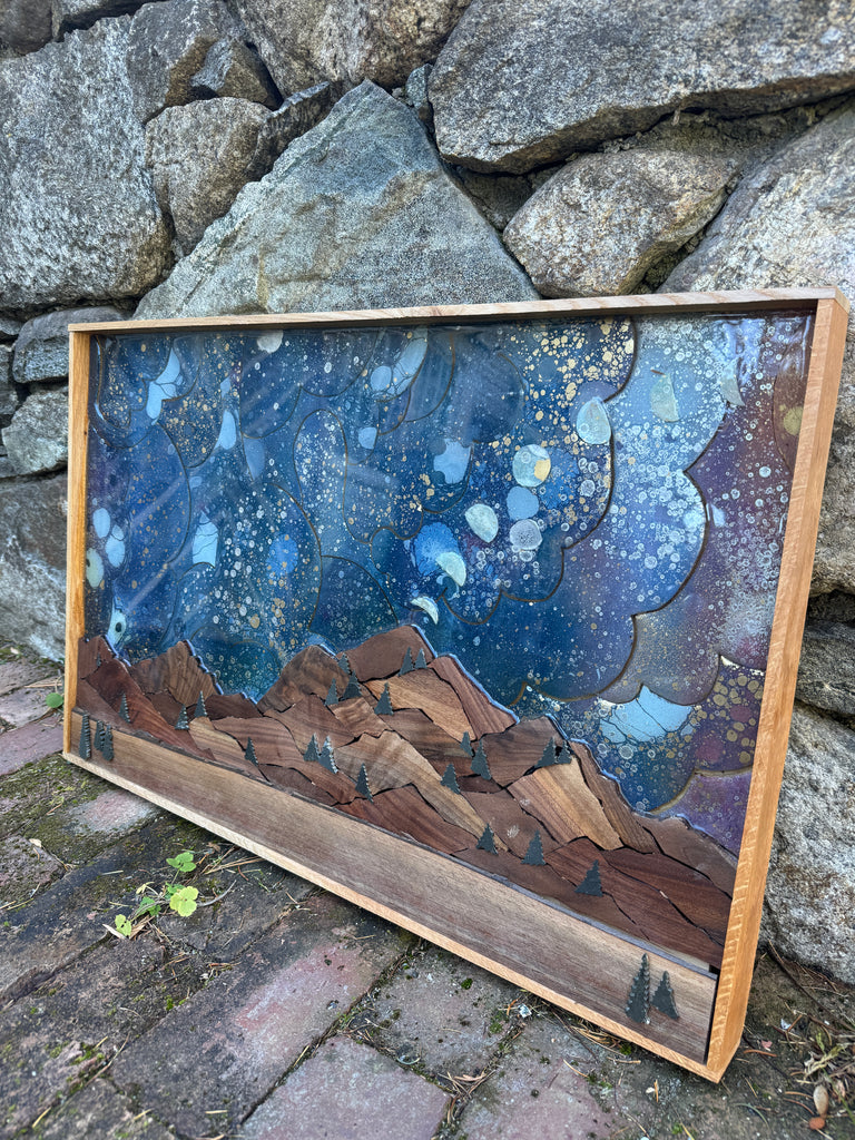 Mountain statement piece with moon phases. Walnut mountain. Slate trees throughout. Ash frame.